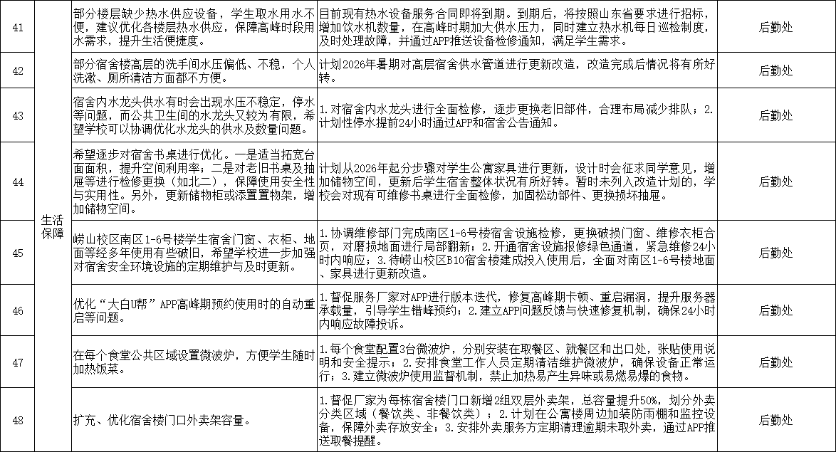 相关部门负责人认真记录并对大部分问题进行了现场回应答复。会后,党委学生工作部会同相关责任部门对有关问题持续调研落实、跟进解决,并将相关工作情况总结梳理形成6类48项意见建议及其答复的工作清单,具体情况如下: