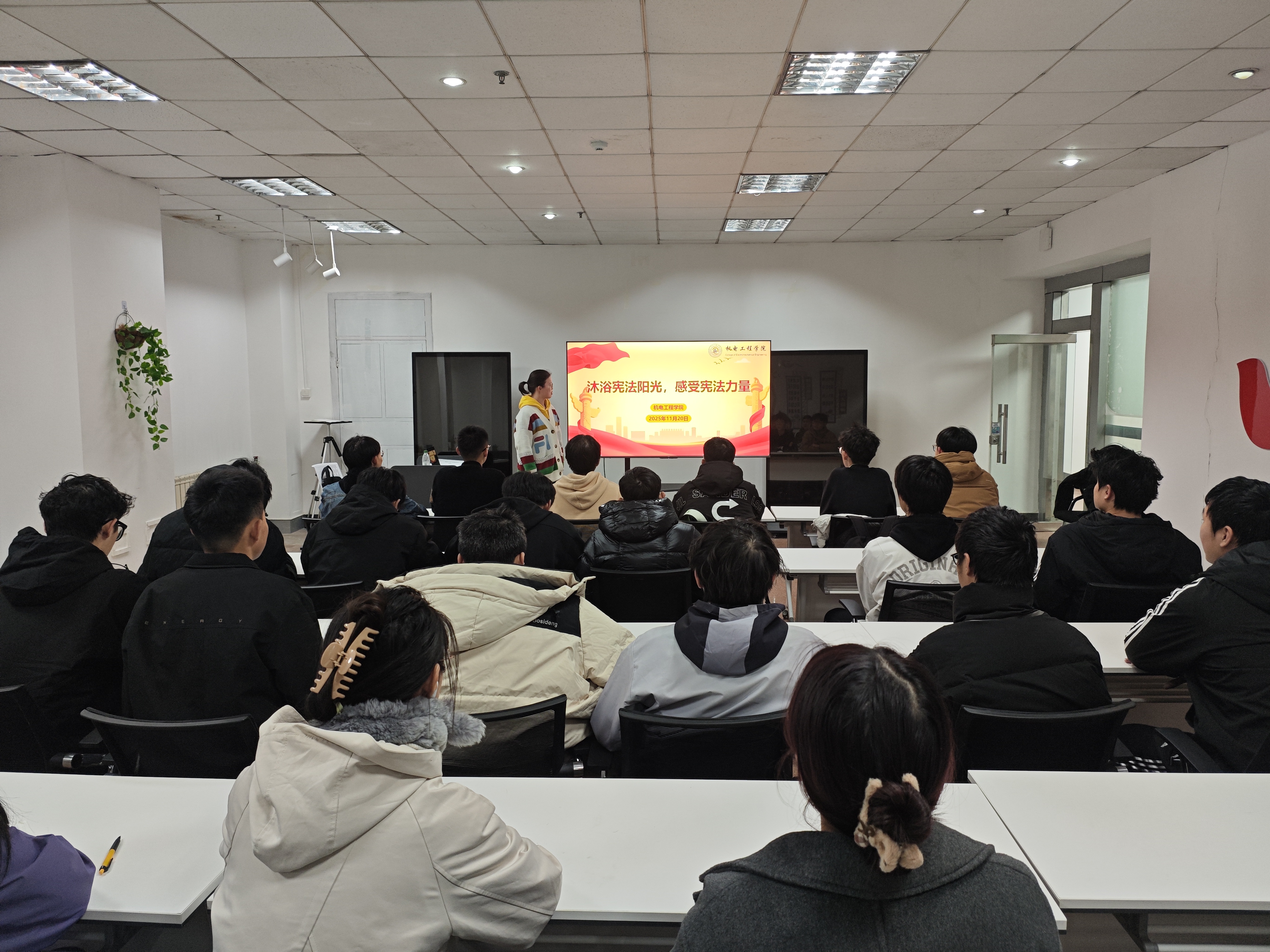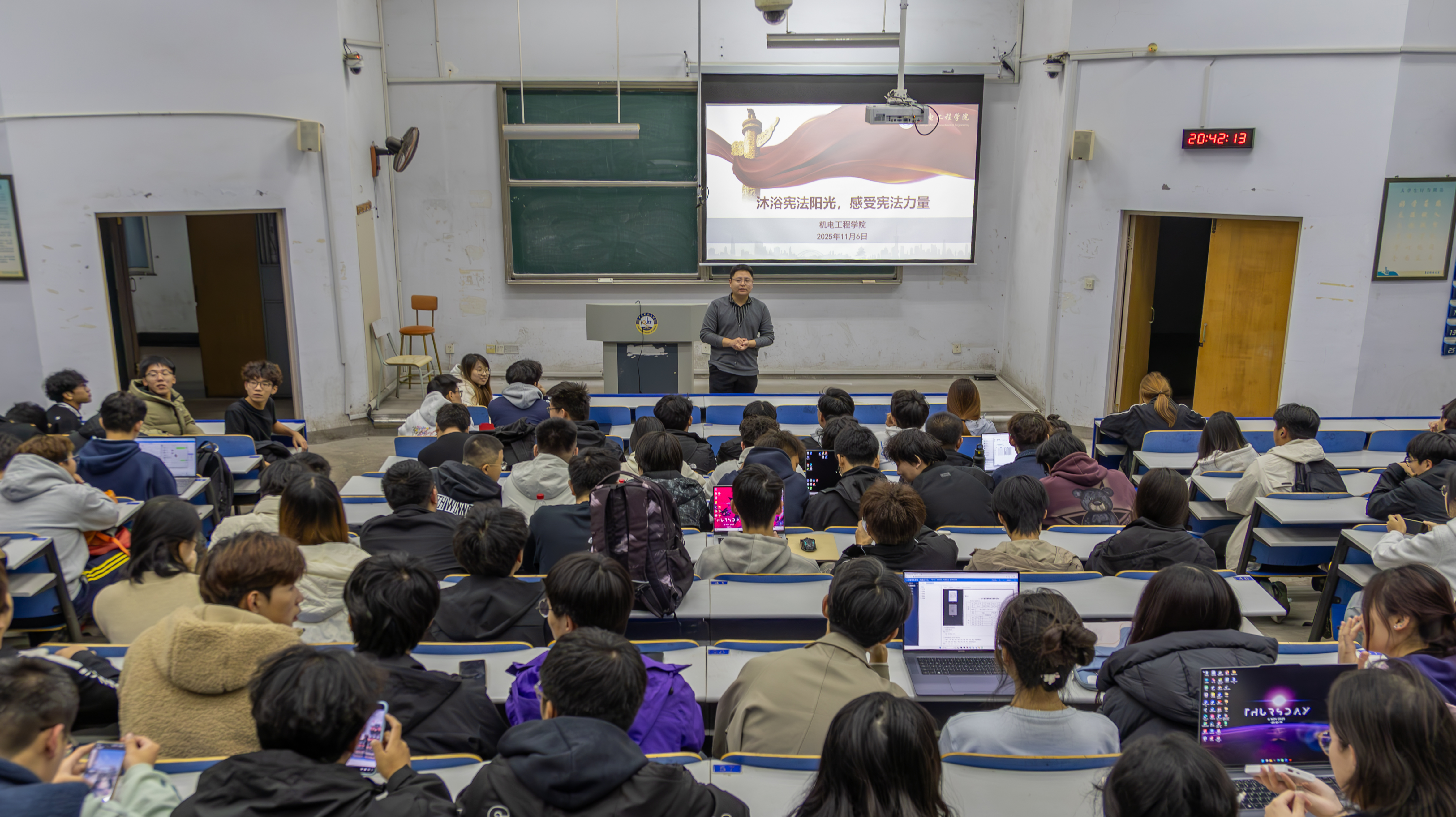 沉浸感渗透:课堂奏响法治最强音。学院在机电楼D3-530举办专题宪法讲座,主讲教师用通俗、生动的讲解,为学生构建清晰完整的法治认知体系。与此同时,各年级辅导员深入班级,通过宪法知识竞赛、小课堂微互动、同唱宪法歌曲等形式,增强课堂参与度和体验感,让抽象的法律条文以可视、可感的方式“活”起来,使法治教育真正做到润物无声。