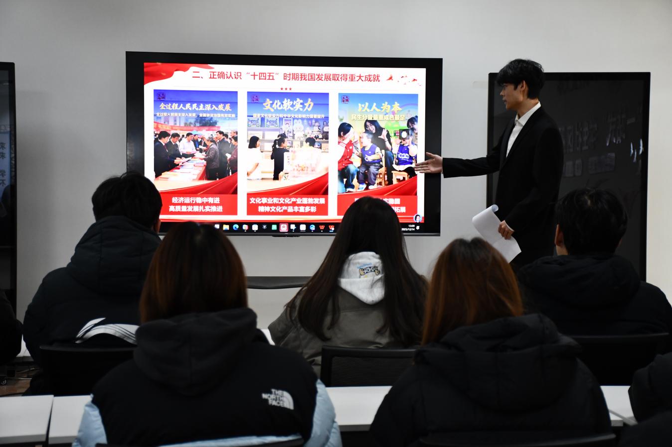 宣讲会上,王峥从党的二十届四中全会召开的时代背景切入,系统阐释了会议取得的重大成就、作出的战略部署以及提出的目标任务。他结合详实的数据与鲜活的事例,全面回顾了“十四五”时期我国经济社会发展所取得的显著成就。同时,针对“十五五”时期经济社会发展的指导思想、重大原则和主要目标进行了深入解读,助力同学们精准把握国家未来发展的宏伟蓝图与战略方向。王峥还号召同学们将学习贯彻全会精神与自身成长成才紧密结合,团结一心、奋勇前行,积极推动全会精神在校园内落地生根、开花结果。