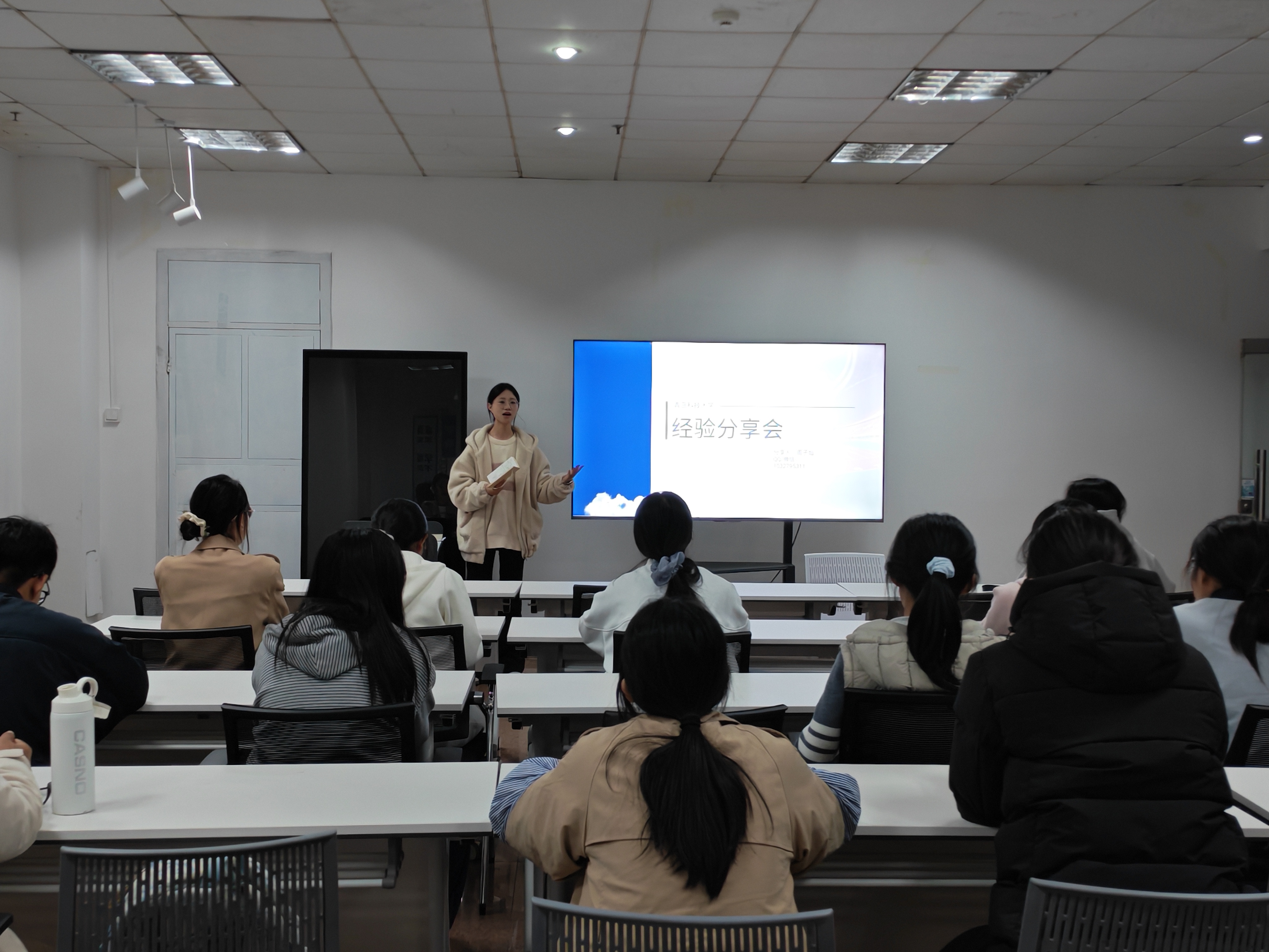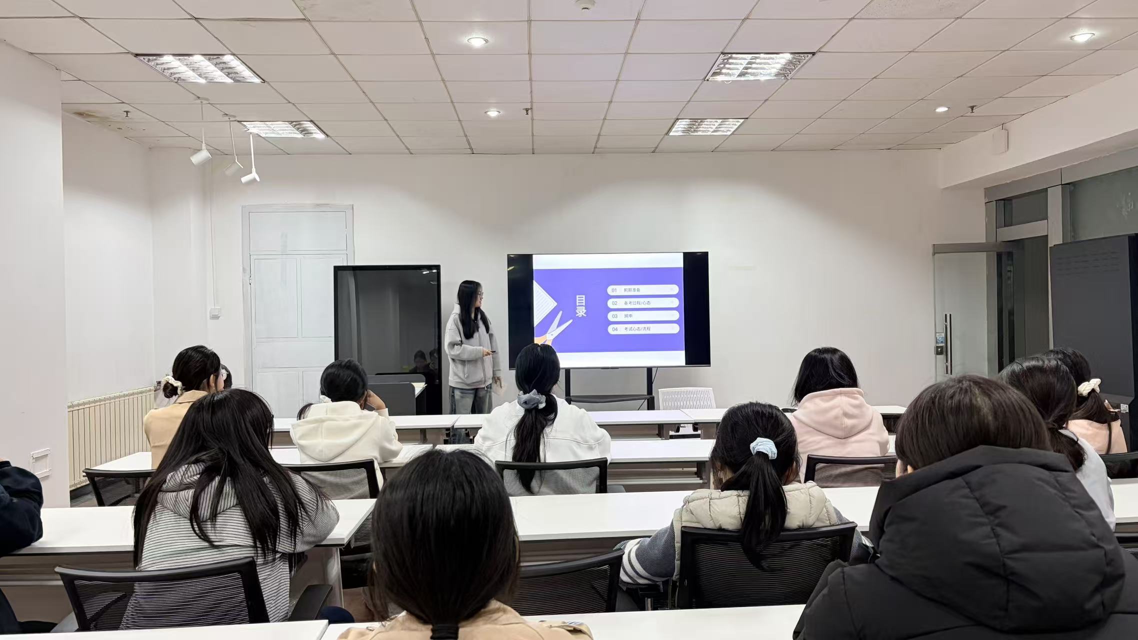 互动环节中,同学们积极提问,围绕备考时间安排、薄弱模块突破、岗位选择等问题与学姐深入交流,现场氛围热烈。