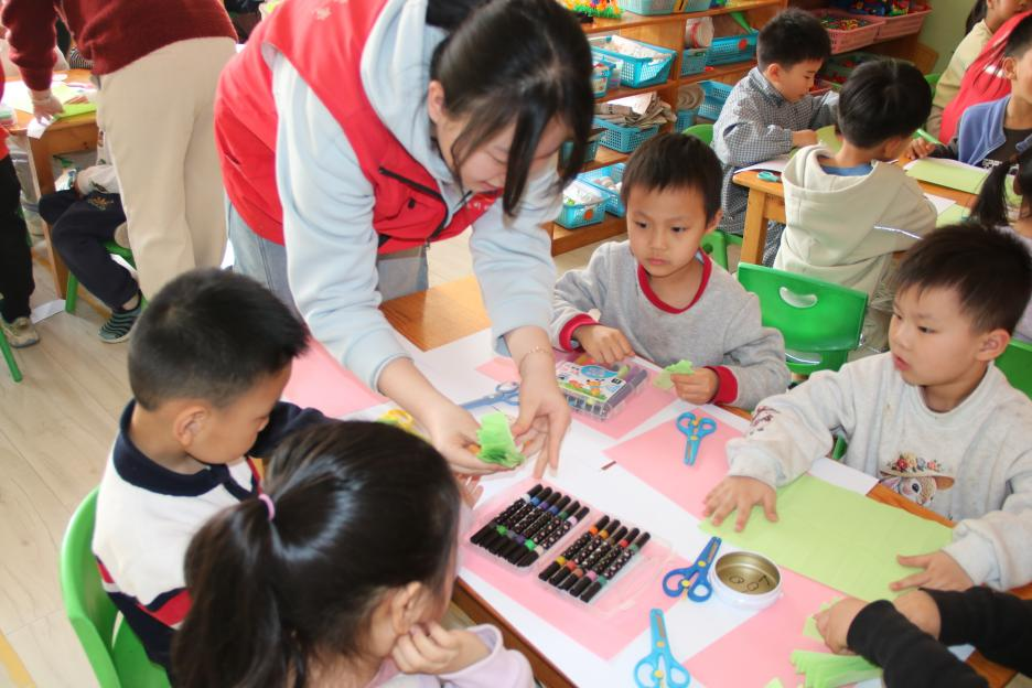 在手工创作环节,孩子们在志愿者的耐心引导下,一步步搭建属于自己的“清明小世界”:用折叠的绿色卡纸铺就层叠山峦,将粉花、白屋错落粘贴,再添上展翅的燕子与垂落的柳枝,最后写下“清明”二字点明主题。小小的卡纸在指尖变幻成立体山水,每一处细节都藏着孩子们对春日的向往,教室满是专注的神情与雀跃的欢呼。