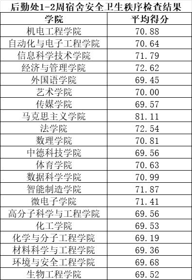 根据学校工作安排,后勤管理处组织公寓管理人员开展崂山、四方校区1-2周宿舍安全卫生秩序检查。本次共检查宿舍4405间,经统计,合格及以上宿舍4295间,不合格宿舍110间。各学院平均得分如下所示。