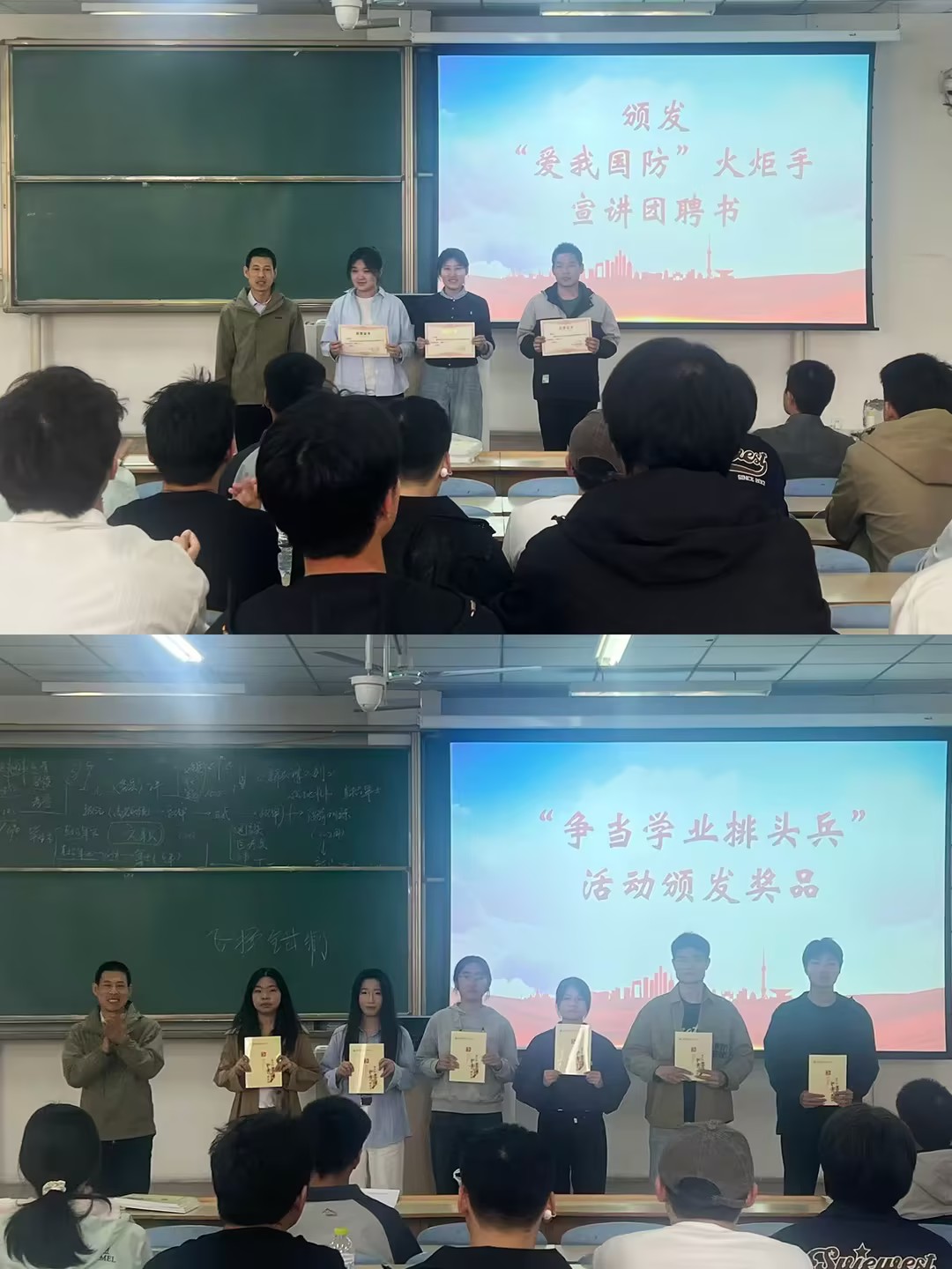 会上,三名退役大学生士兵代表依次分享了自己的服役经历和感悟,讲述了军营的成长与蜕变,赢得了在场同学的阵阵掌声。徐连基为他们颁发了“爱我国防”宣讲团聘书,为军协、国防强军班成员颁发“争当学业排头兵”活动奖品。同时,校区启动了新一期体能训练打卡活动,鼓励同学们以强健体魄提升国防素养。