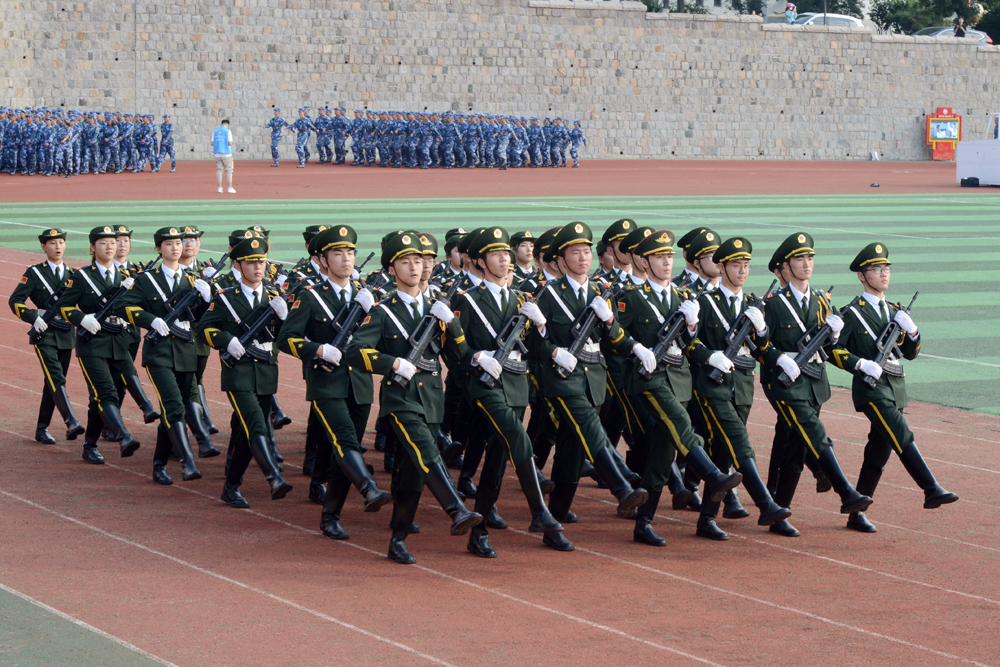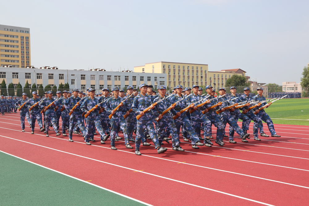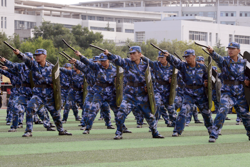 在军训成果汇报中,先后进行了盾牌搏击操、擒敌拳、棍术、匕首操、班战术与战地医疗救护、队形变换等训练科目演练,军训方队集体合唱红歌和校歌。