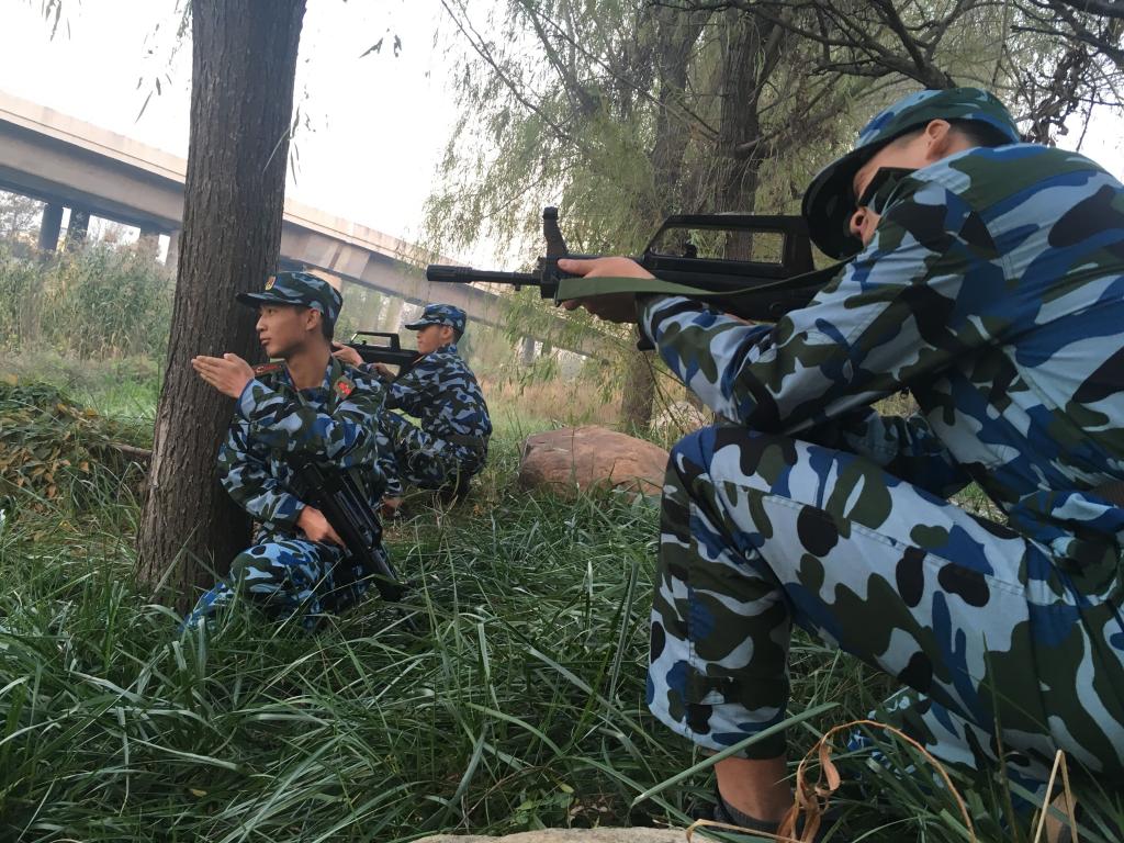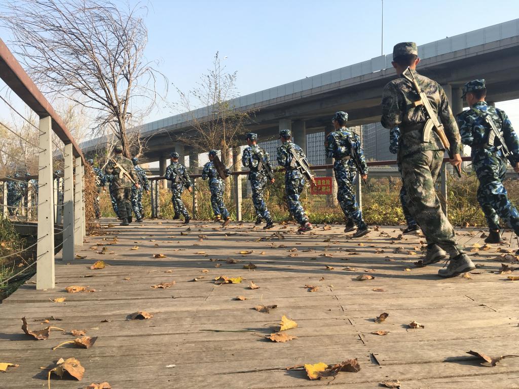 从学校南1门出发,徒步经舞阳路,沿李村河开展军事技能素质拓展活动。为了确保此次活动能够安全有序的实施,武装部设定了科目演练方案、情况处置,快速通过沾染地段,通过染毒或放射性沾染地段的防护措施等。军事爱好者协会制定了周密的活动方案,提前勘察了路线、各任务点活动的场地。途中同学们身着迷彩服,头带迷彩帽,腰扎武装带,携带训练专用95步枪。各队队长带领队伍前进,行进过程中同学们精神抖擞、斗志激昂、整齐有序。