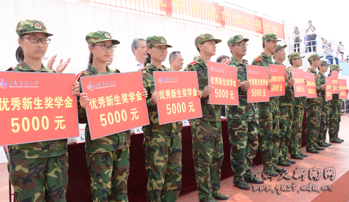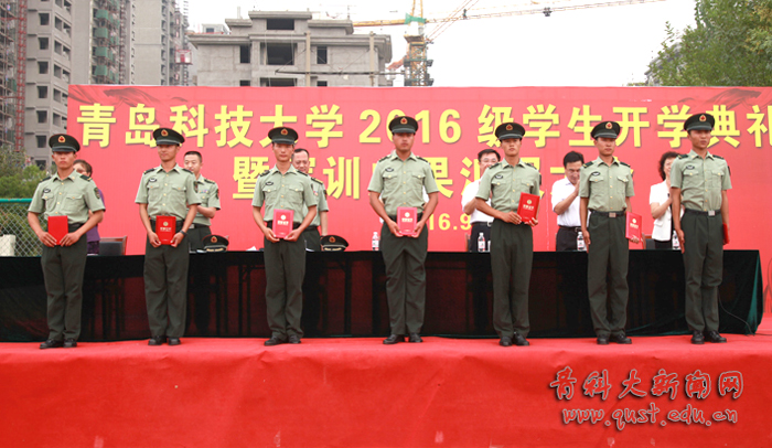 典礼上,温常升大校代表青岛警备区肯定了青岛科技大学在国防教育工作中取得的成绩,并对全体参训教官和学生提出了希望和要求。副校长王文哲在典礼上宣读了《青岛科技大学关于表彰2016级学生军训先进集体和优秀教官的决定》,副校长李庆领宣读了《青岛科技大学关于颁发2016年优秀新生奖学金的决定》。获奖的军训先进营、内务先进营、优秀教官派代表上台领奖,17名新生领取了新生奖学金,每人奖励5000元。山东省教学名师叶庆国教授作为教师代表发言,对2016级新同学的到来表示热烈欢迎,并对同学们的学习和生活提出了期望和要求。在校生代表和新生代表分别在开学典礼上发言。