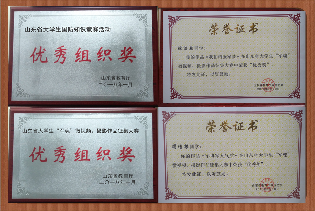 日前,山东省国防教育协会年会在烟台举行,会上对2017年度全省学校国防教育活动进行了表彰,我校多项活动获奖:1、山东省学校国防教育知识竞赛优秀组织奖,2、山东省大学生“军魂”微视频、摄影作品征集大赛优秀组织奖,3、《我们的强军梦》获微视频类作品优秀奖,4、《军协军人气质》获摄影类作品优秀奖。
