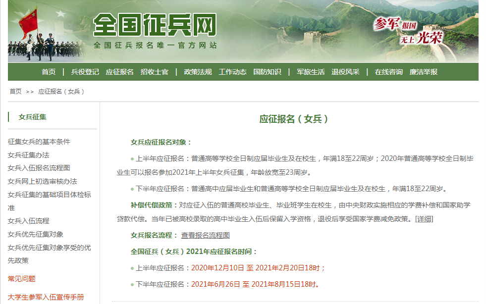 2021年下半年女兵应征报名6月26日开始