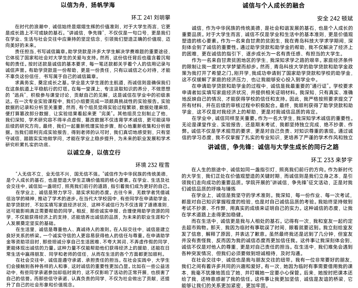 环境学子紧扣主题,结合自身经历与思考以及助学贷款、诚信考试等实际情况,阐述对诚信的理解,展现出在科研、学习、生活中争当“诚信先锋”的态度,内容丰富、情感真挚、立意深刻。