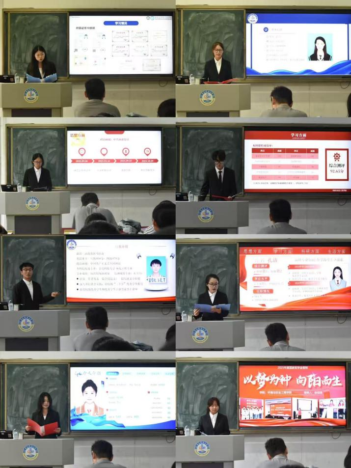 答辩会严格遵循“公平、公正、公开、择优”的原则,经过个人申报和资格审查,分别有16名研究生和8名本科生参加国家奖学金现场答辩,8名本科生参加省政府奖学金现场答辩。各位候选人以PPT演讲的形式围绕思想道德修养、学业成绩、学科竞赛、社会实践、志愿活动、学生工作、学生活动等多方面多角度全面展现个人综合能力和青春风采。