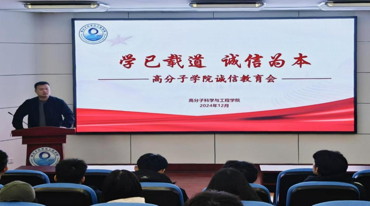 为切实增强新时代青年学子的诚信意识和责任担当,12月20日,高分子科学与工程学院在学院401会议室组织2024级学生骨干,开展以“学已载道 诚信为本”为主题的诚信教育会。本次会议旨在引导广大学生树立正确价值观,深刻理解诚信与成长间相辅相成的重要关系,从而把好诚信关,筑牢契约精神;把好纪律关,助力成长成才,全面提升学生的综合素质。