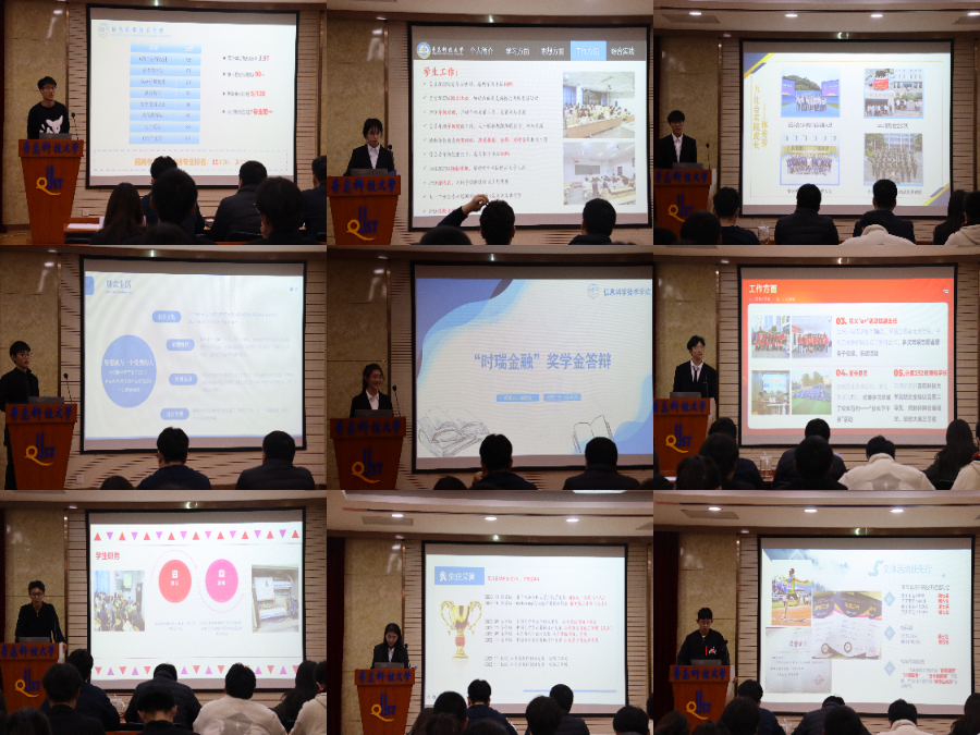 首先,惠保鑫向大家介绍了评审团成员,解释了投票要求,说明了答辩注意事项。随后,19位候选人以PPT形式进行公开答辩,从思想道德、学术科研、科技创新、社会实践、文体活动、宿舍建设、自我发展等多个方面分享了自己在大学期间的成长进步,展示了信息学子的优良学风。