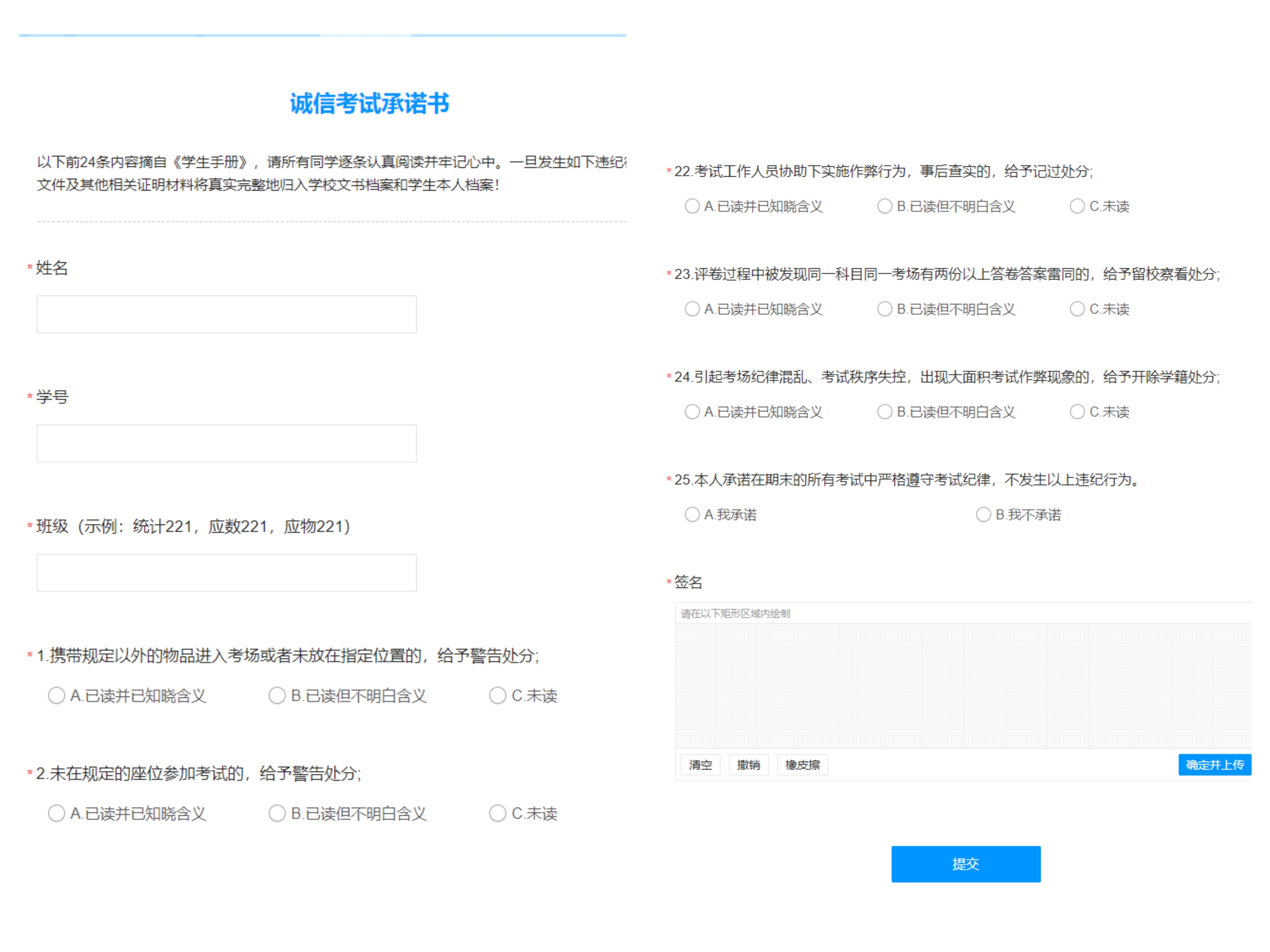 开展“诚信之心”承诺践诺行动。学期末,学院统一制作带手写签名的电子版诚信考试承诺书并组织全体学生签订,通过承诺践诺的形式引导学生逐项重温学生手册中作弊相关的纪律处分规定,严肃考试纪律,以考风促学风。