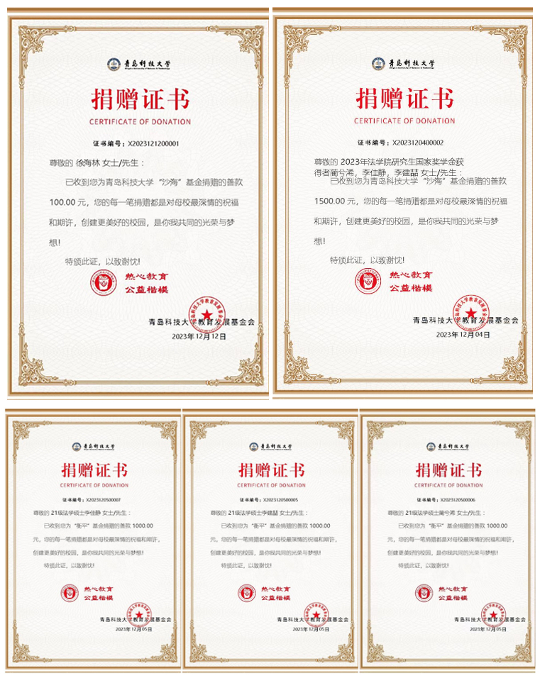 四位捐赠者表示,饮水思源,缘木思本。取得今天的成绩离不开学校和学院的悉心培养,四位学生秉承着“明德、笃学、弘毅、拓新”的校训和“崇法、重德、博学、笃行”的院训,不忘初心,踔厉奋发。他们的捐赠既是对学校和学院培养与关怀的回馈,也是对学院和老师们支持的感恩,希望能对学院各项事业的开展起到积极作用,同时对提高学生专业综合素质和学院的高质量发展作出应有的贡献。学院对获奖者的捐赠表示了感谢,并表示将以此为契机,进一步推动学院的教学和科研和人才培养工作,为学校“特色鲜明,走在前列”高质量发展做出更大的贡献。