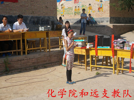 首先,陈雪霞书记作为代表接收了青岛科技大学和远支教队捐赠的物品,其中包括由工商银行青岛分行提供的两台电脑、价值1500元的文体用品,和远团队提供的海边贝类及等等。陈雪霞书记高度赞扬了和远支教队在此次支教活动中对峁堡小学的教学工作认真、负责的态度,肯定了和远支教队在传播外界新鲜知识、竭力推进特色课程方面做出的努力,表达了对青岛科技大学和远支教队的感谢和感激之情。随后化学与分子工程学院分团委书记陈兵代表讲话,对在支教过程中彭阳县领导及峁堡小学全体师生的大力配合表示感谢,对和远支教队全体成员的工作作出了好评。随后各年级优秀学生代表上台领奖,每个年级派出4名同学,由青岛科技大学领导及彭阳县领导颁发奖品,捐赠仪式圆满落下帷幕。看到孩子们纯真烂漫的表情,和远支教队的志愿者们脸上也都露出了笑容。支教队队长郭维表示,为孩子们的学习和生活带来一丝帮助,是此行的目的,也是此行最大的收获。