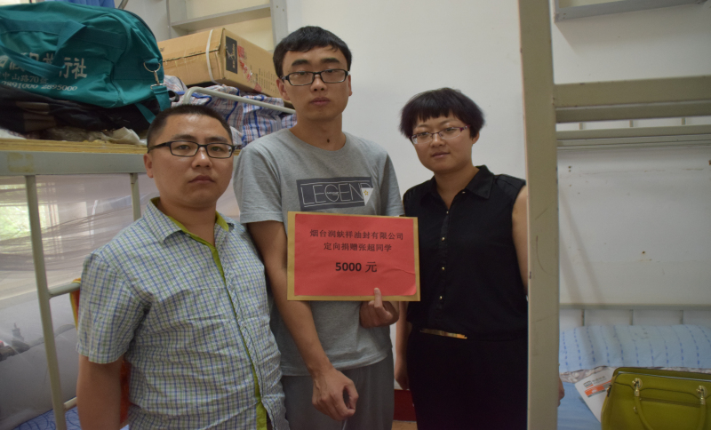 6月28日上午,毕业离校之际烟台润蚨祥油封有限公司校友特意从烟台赶来学校为张超捐赠了5000元爱心基金;