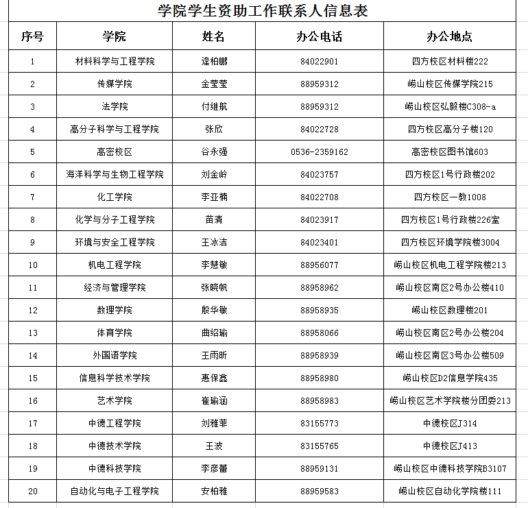 为进一步完善学校学生资助管理工作体系,方便学生得到及时、周到的资助服务,全面推进困难学生精准资助。现向全校公布《各学院学生资助工作联系人信息表(2020年9月)》。