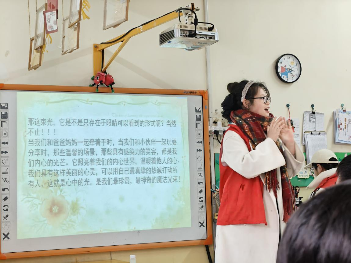 活动现场,志愿者们化身小老师,用耐心与温柔陪伴孩子们探索光的秘密,暖场导入时,志愿者先以“能不能看见光”的趣味提问唤醒好奇心,消除孩子们对陌生实验的隔阂感,实验演示环节,志愿者精准操作手电筒与棱镜,避免强光照射孩子眼睛,让孩子们了解实验的过程,用激光笔照射配好的胶体和喷雾瓶模拟水雾,让孩子们看到清楚的光路。演示完毕后,其他志愿者则分组和孩子们一起动手实验,轻声鼓励内向的孩子大胆观察。孩子们纯真的笑脸与主动分享的热情,也让志愿者们深切体会到童真回馈的温暖。