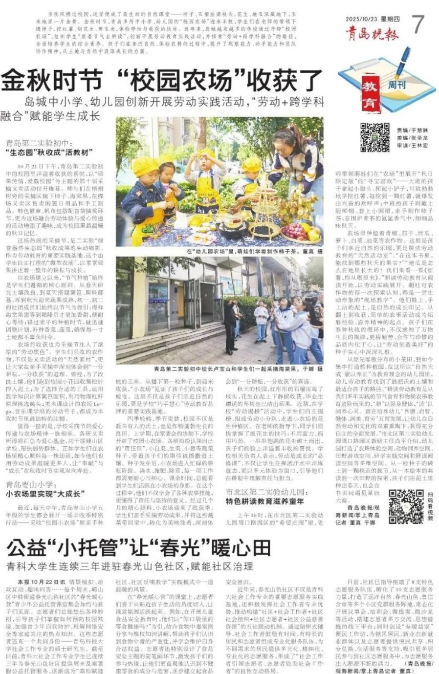 每个周末,崂山区中韩街道春光山色社区的“春光暖心营”青少年公益托管课堂总是充满欢声笑语。情景模拟、游戏互动、趣味问答,学院青年志愿者们围绕心理健康、知识教育等方面开展服务活动,逐渐成为“高校赋能社区、社区反哺教学”实践模式中一道温暖的风景。