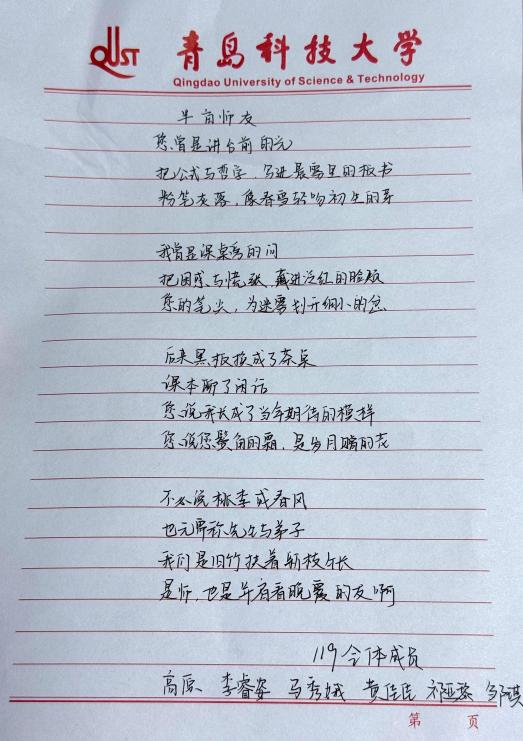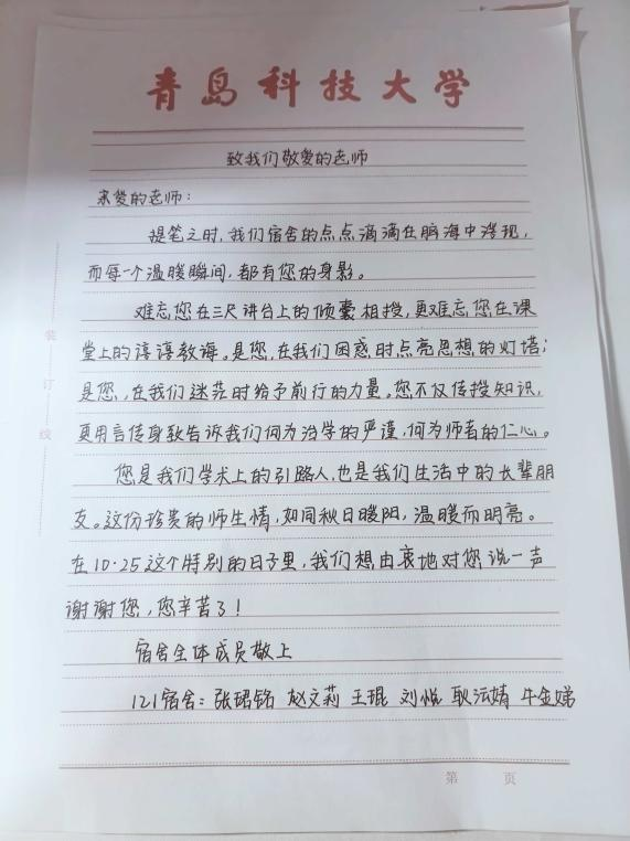 各宿舍充分发挥集体智慧与创意,作品形式丰富多样,每一份作品都凝聚着宿舍成员的共同心意,成为承载师生情谊的珍贵载体,尽显马院学子对恩师的深厚情感,切实推动形成“尊师、爱师、敬师、亲师”的浓厚院风。
