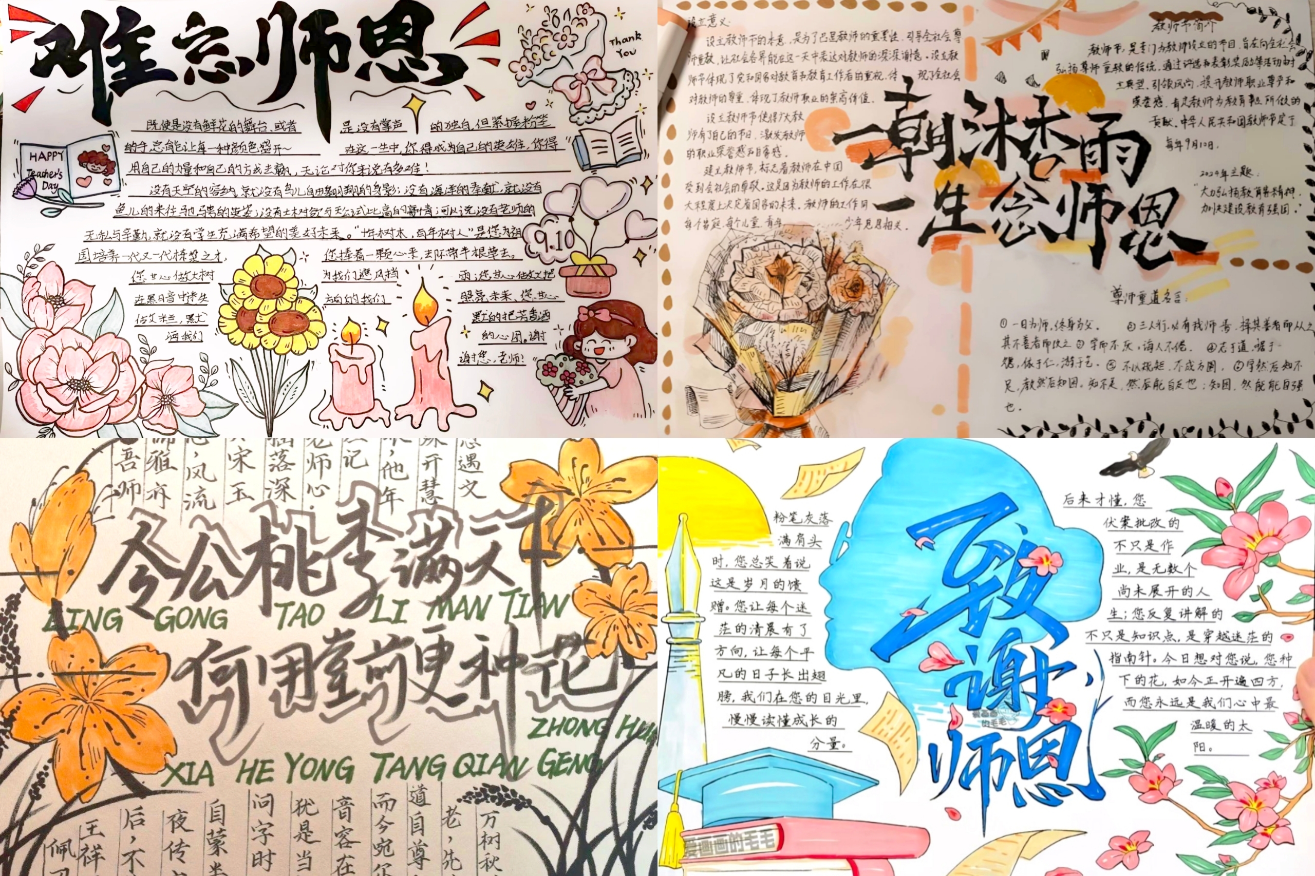 ——“三尺讲台情,一纸绘恩意”手抄报创作。同学们以画笔为媒介,勾勒心中教师的授课身影、课间关怀等难忘瞬间,文字部分则记录师生相处的温暖细节,让“感恩”从抽象情感变为具象画面。