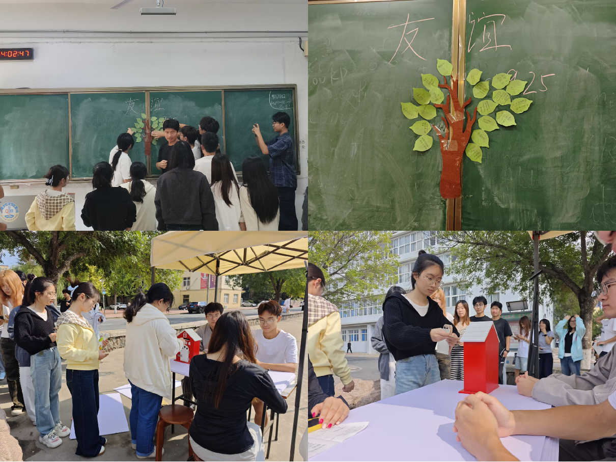 活动在轻松融洽的氛围中展开,主要包括三大板块:“叶语传心——友谊树共建”、“笔端有温度——明信片寄情”和“合作见真情——双人趣味挑战”。在“友谊树共建”区域,同学们在叶片形卡片上写下对朋友的感谢或祝福,共同贴绘成一棵茂盛的集体树,每一片叶子都承载同窗情谊、凝聚真挚心意。“明信片寄语”环节则提供协会精心设计的主题明信片,不少同学选择现场书写、现场赠予,或投入“未来邮筒”委托协会转交,让言语传递关怀、以文字温暖彼此。