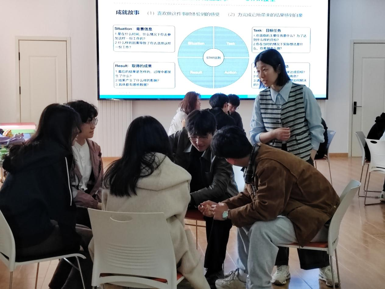 活动在刘璐老师的引导下有序展开。“破冰游戏”环节,学生利用与自己最相像的动物进行自我介绍,这一新颖的方式不仅迅速拉近彼此的距离,打破陌生感,更为后续的活动奠定良好的基础;“国王与天使”角色分配环节,学生互为“国王”与“天使”。通过作为“国王”收到来自“天使”的匿名鼓励与支持、作为“天使”默默关注并帮助自己的“国王”,感受到来自团队的温暖和关怀,体验了在团队中默默付出、用行动传递快乐的真谛,深刻体会到如何在团队中扮演好不同角色,为班级的发展贡献力量;“分享学生工作成就故事”环节,学生利用STAR模型回顾并分享学生工作的收获与成长,通过“情境重现—目标拆解—行动复盘—成果总结”,深度剖析在学生工作中的关键成长节点,从班级管理困境突破、活动策划创新破局到矛盾调解生态重构,逐步明晰个人优势与能力发展路径,深刻体悟到自身在学生工作中的责任与担当,更深刻理解了“个人成就团队,团队托举个人”的共生哲学。