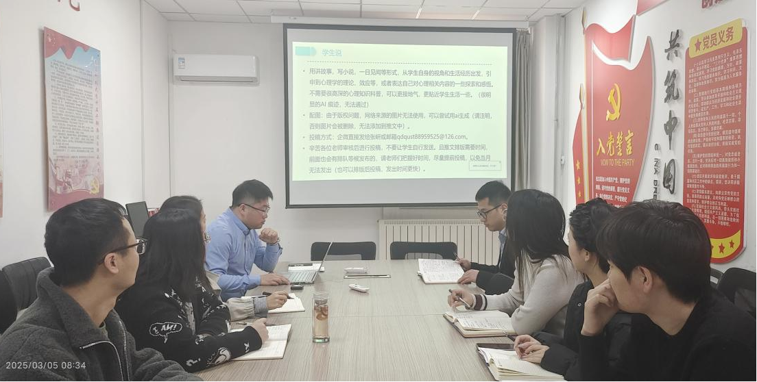 会议聚焦学校心理健康教育与咨询中心的春季学期工作部署,系统介绍2025年心理健康教育重点工作规划及创新实施方案。会上,郑开齐结合学院学生实际,部署了学院春季学期心理相关工作,对学院心理工作重要方面进行了说明,详细解读了春季学期心理测评的相关时间节点要求和注意事项。会议最后,学院党委副书记兼副院长严增兴做会议总结,并对学院心理工作提出要求:全体辅导员思想上要高度重视学生心理健康工作,在日常工作中扎实细致,有方法,有计划,有温度的深入了解学生,不断提高个人专业水平。