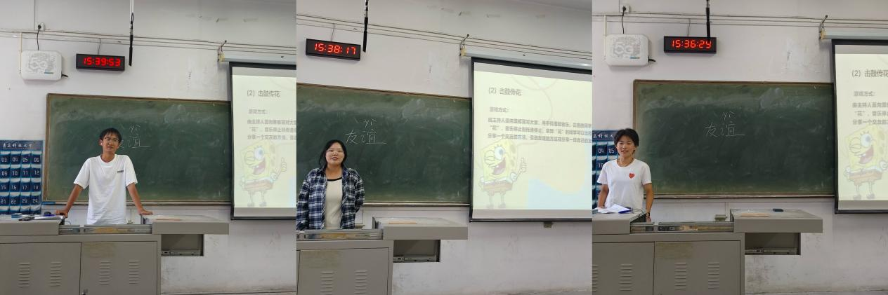 击鼓传花 在“十五的月亮十六圆”结束后,主持人又带领大家进行了“击鼓传花”。活动开始,主持人面向黑板背对大家,用手机播放音乐,“击鼓传花”游戏正式拉开帷幕,“花”在同学们的手中以“S”形快速传递,音乐停止后,拿到“花”的同学有的选择施展才艺——唱歌、讲笑话,有的选择分享交友经验或与朋友之间难忘的小故事。在这个过程中,同学们既学会了勇敢表达自己,也在欣赏他人的过程中收获了欢乐,学到了交友技巧,也增进了彼此之间的情感交流。