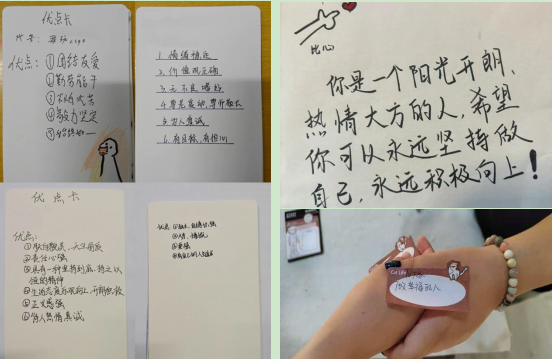 活动由三个环节构成。第一个环节是“优点大轰炸”,参与者在便利贴上写下被赞扬同学的名字及其优点,并将这些便利贴投入收集箱内。随后,主持人逐一宣读这些内容,由现场同学猜出作者。这些便利贴卡片作为礼物赠送给被赞扬的同学,以作纪念。暖心的交流使得平时藏在心底的话语得以被诉说,加强了彼此间的正向互动。