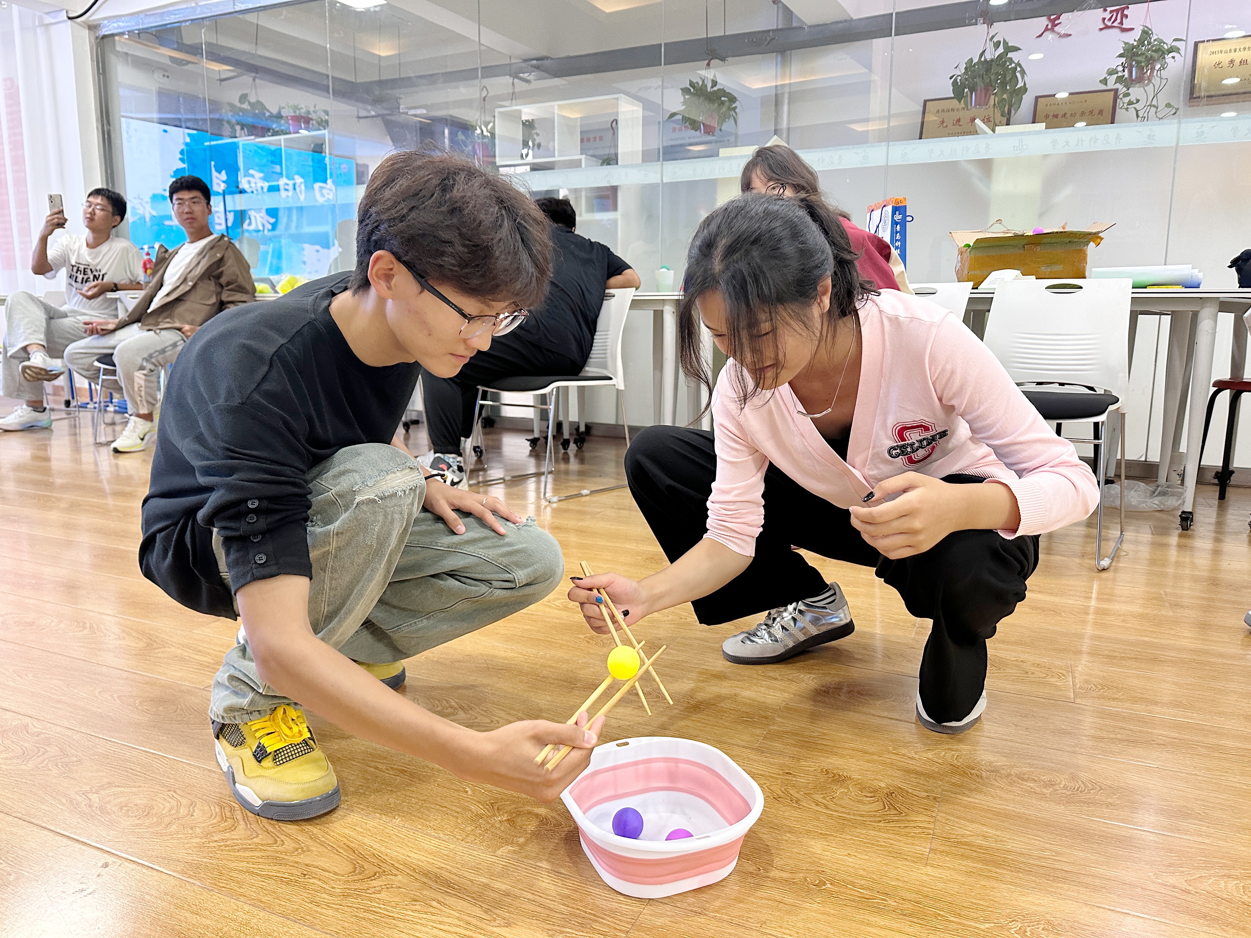 四组学生代表用筷子夹起盒子里的乒乓球,以最快、最稳的手法将它们夹到指定盒子,现场气氛热烈非凡,加油喝彩声此起彼伏,增强了彼此的理解和信任,培养学生合作解决问题的能力。
