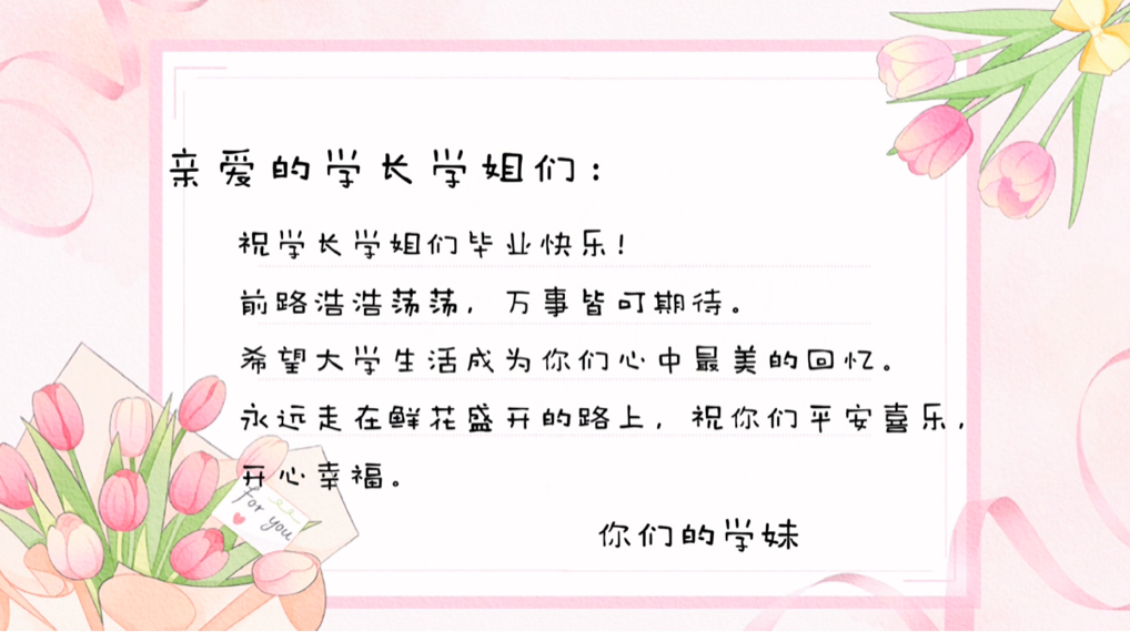 在短视频征集中,同学们以创意和热情,通过文字、言语表达、音乐、诗歌等方式为学长学姐们送上了最真挚的祝福。祝愿学长、学姐毕业快乐,不负青春理想,踏浪逐梦前行,为自己、为他人、为社会贡献自己的青春力量。同时邀请毕业生学长学姐为在校生学弟学妹传经送宝,分享成长点滴。