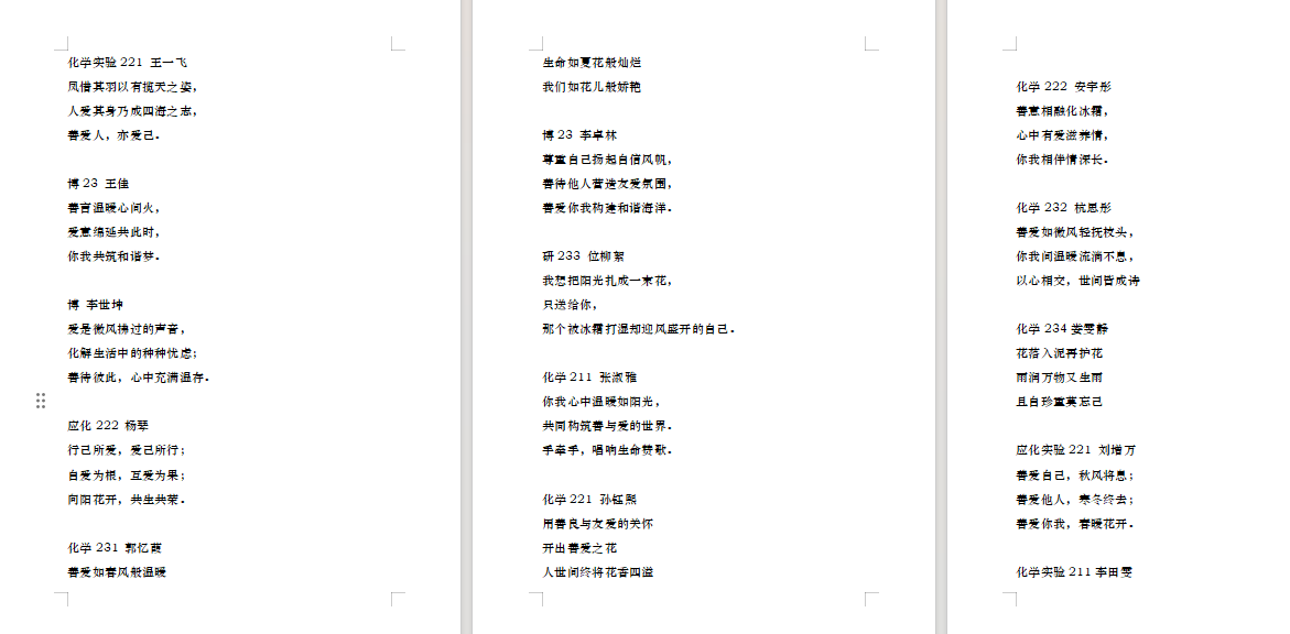 化学院心理健康协会面向学院全体学生于3月25日前后开展“三行诗语,寄语你我”征集活动。活动收到学院本硕博“善爱你我”主题三行诗300余件。“善爱如微风轻抚枝头,你我间温暖流淌不息,以心相交,世间皆成诗。”三行短诗围绕“善爱你我”主题,以诗歌的形式引导同学们关注自我,善待他人,表达对自己的美好寄语,营造良好的心理健康教育氛围。