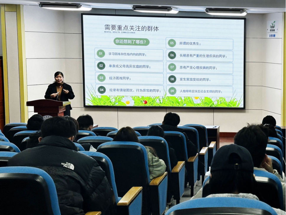 邢瑛还重点讲解了工作中需要关注的一些特殊群体,如存在心理问题的学生、家庭背景特殊的学生等。她强调,心理委员在日常工作中要严格遵守保密原则,不传播同学隐私,不私自保留同学心理信息相关资料。