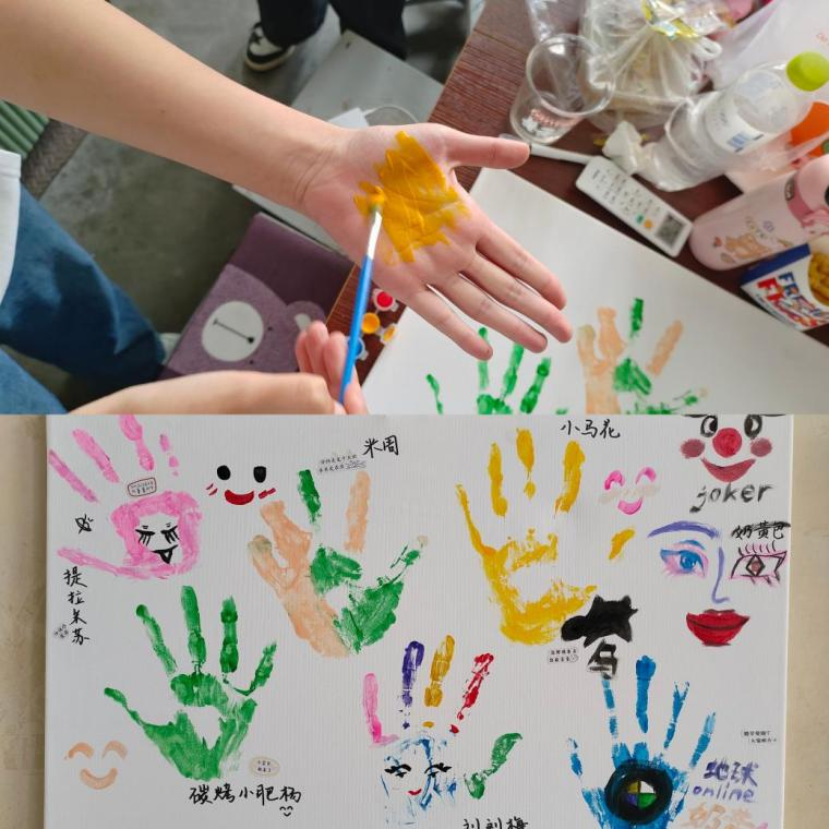 活动中,同学们将不同颜色涂于掌心,以手掌为笔,印于画布,同时根据想要表现的动作或植物形象,选择适合的手印方式进行组合表现,再添加上喜欢的元素,绘制中无形将压力转化成创作,在色彩中寻找能量,在图形中诉说故事,在释放情绪中激活内在能量。过程中,学生们用线条和色彩践行青春,用画笔书写美好,不同的创意和风格自由挥洒、绘于纸上,同学们相互交流相互分享,活动现场气氛十分活跃,有效的实现了情绪的自我排解和建立和谐的团体氛围。