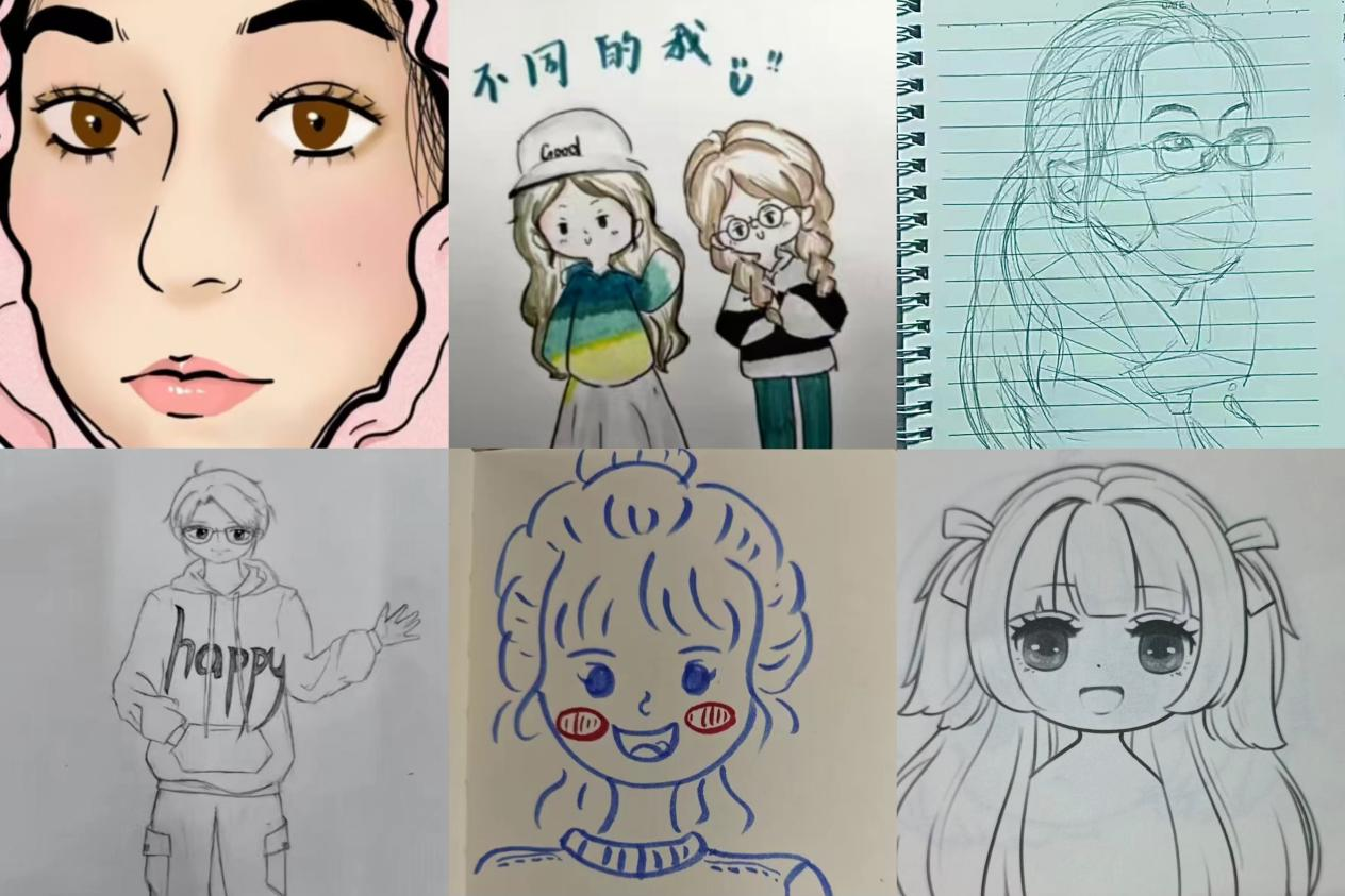 同学们采用手绘、板绘等多种方式画出心中的自己,通过水彩、速写、厚涂等等绘画方式,同学们将自己的形象画在纸上,可爱、帅气、优雅各具特色,把脑海中的自我定格在这一瞬间。