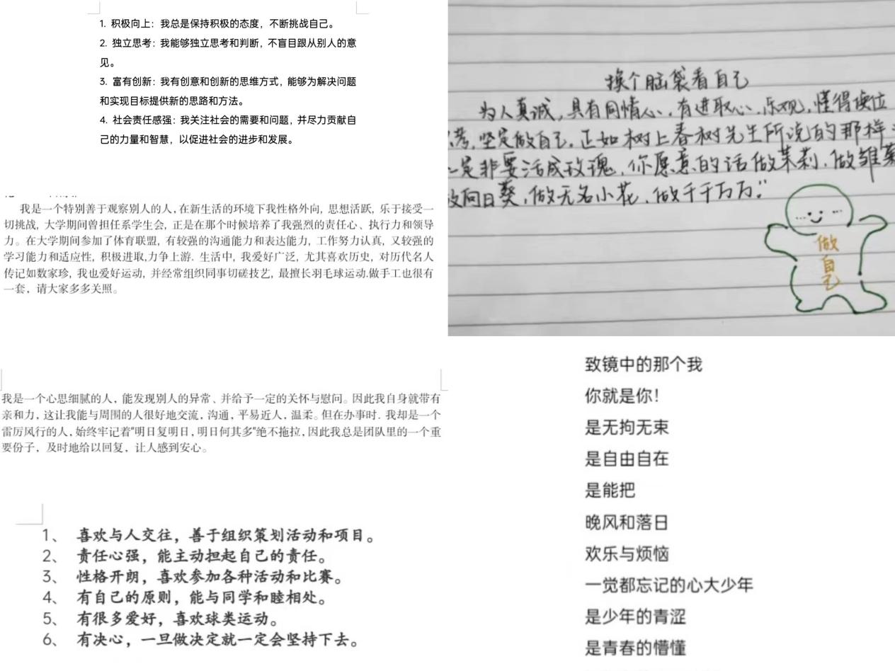 以“换个脑袋看自己”为主题,详细写下自己的优点。优美的辞藻、贴切的描述、有趣的形容,同学们用丰富的语言描绘出自己的优点,一首小诗,一段文字,同学们写下自己在各方面的长处,字里行间展现青年学生的自信自强,彰显化工学子的青春活力和积极向上。