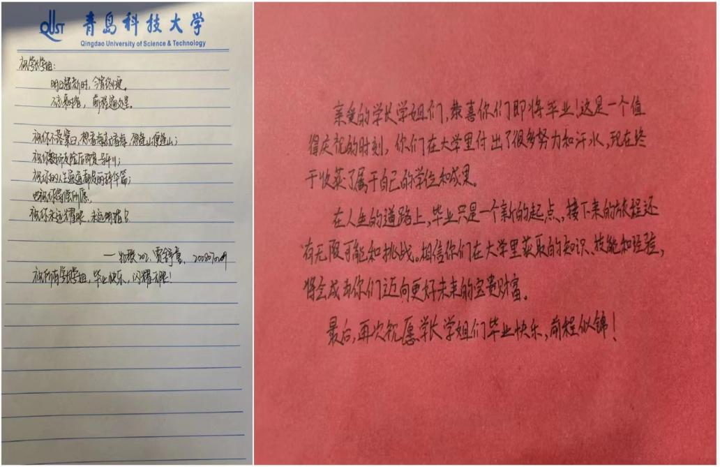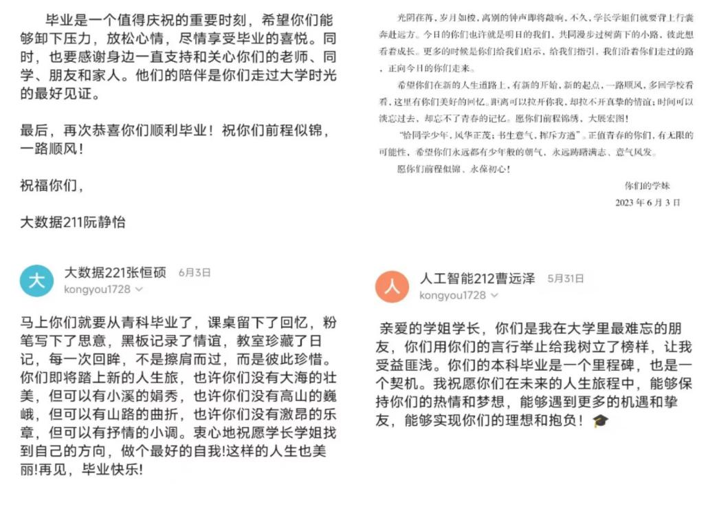 学弟学妹们向即将毕业的学长学姐表达了自己最衷心的祝愿。祝愿学长学姐们的未来熠熠生辉,前程似锦。同时,也体会到大学四年时光如梭,勉励自身,以学长学姐为榜样,充实自己。