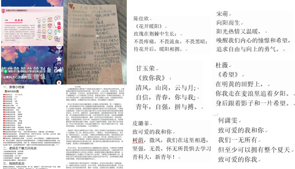 一是开展“致可爱的我和你”三行诗评选征集活动,二是征集心理健康知识科普抖音短视频,三是征集心理健康知识宣传文章。通过征集心理健康活动作品,将同学们在大学生活中的心理活动、生活体验及内心感悟展现出来,诠释心理健康理念,普及心理健康知识,激发同学们内在的心理韧性,帮助同学们以更加积极阳光的心态面对大学生活。