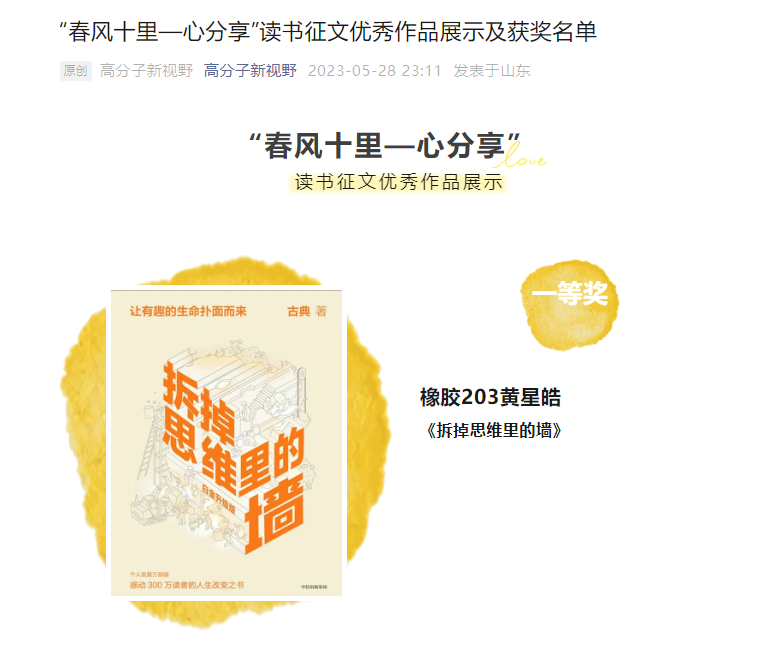 据悉,高分子科学与工程学院历来重视大学生心理健康教育工作,依托学院“橡阳”心理工作站和新视野心理健康协会开展了全方位、多角度的心理健康教育与知识普及。工作中始终坚持“围绕学生,关照学生,服务学生”,不断探索新方法,开拓新阵地,确保心理健康教育工作接地气,有实效。本次“拥抱青春,橡阳绽放”心理健康节系列活动的举办,为在校大学生普及心理健康知识,传递心理成长正能量,在提高学生助人自助,自我调适,自我成长等方面起到了积极的促进作用。
