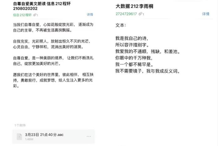 此外,“阳光e+”心理工作站还组织了以珍视自我、守护心理健康为主题的线上情景短剧文本配音活动。大数据212李雨桐、信息212程轩等同学用真诚、热烈的声音进行了美文朗读的音频录制。信息212班的王玉冰等同学则用短视频抑郁症患者在朋友的陪伴、鼓励下树立自信并从阴影中走出来的故事体现出自爱对心理健康的重要价值。