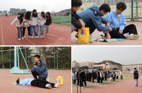 急救知识演示。通过同学讲解并演示心肺复苏和包扎伤口的相关知识,让同学们切身感受到急救的重要性,也让学生更加重视生命、珍爱生命。