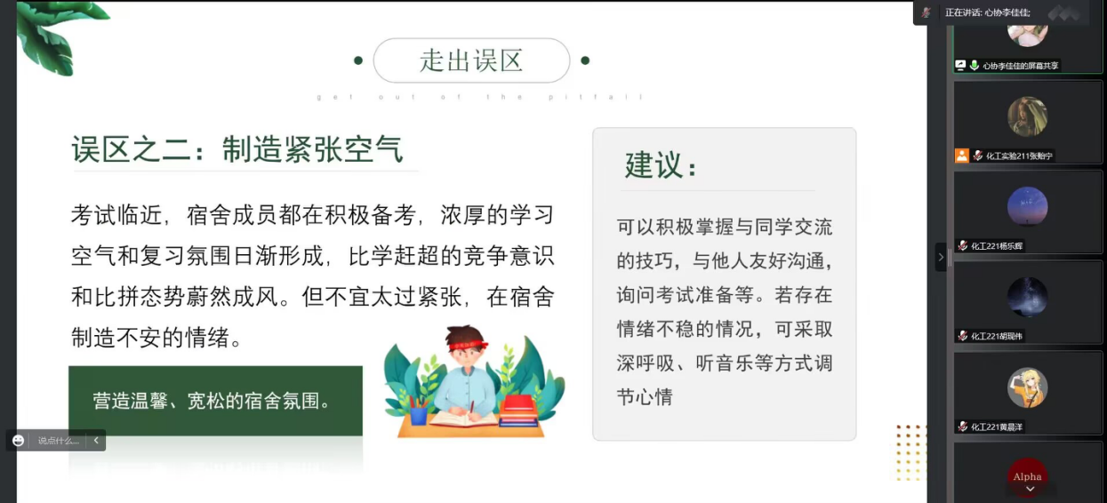 李佳佳同学分享了考试临近应该营造温馨放松的宿舍氛围。宿舍成员积极备考,会产生浓厚的学习氛围和复习氛围,这种意识有利于我们自身和学业的进步和发展。李佳佳同学还提出几点建议:要采取积极友善的态度和同学交流,彼此分享复习的进度和考试准备,通过深呼吸听音乐等方式调节自己不稳定的情绪。让自己既能够拥有积极向上的备考态度,又能有融洽的宿舍氛围。