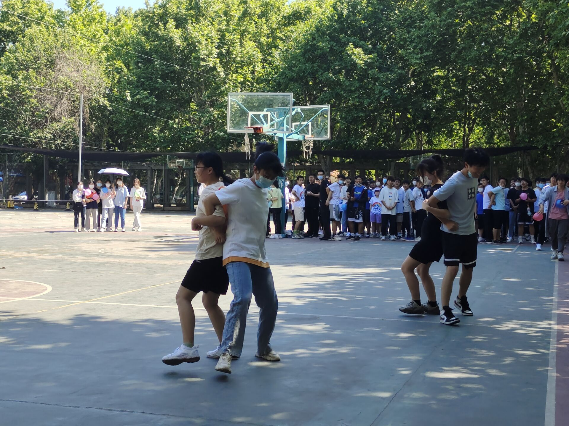心心相印比赛中,参赛队员需要背靠背把气球夹在中间,并在抵达终点之前保证气球不被挤爆,锻炼了同学们的团结合作与肢体的协调能力。