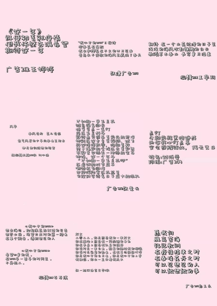 一年之计在于春,当前疫情给每个人的生活和计划带来了很多不确定性,但是也给每个人带来了更多对美好的向往和期望。同学们纷纷动动手,拿起笔,为自己写一首诗,记录下自己对新的一年的美好期待。