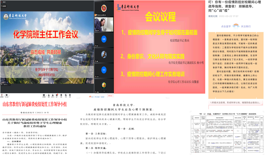 组织学习《山东省教育厅新冠肺炎疫情处置工作领导小组关于做好当前疫情形势下学生心理健康教育工作的通知》和《青岛科技大学疫情防控期间大学生应急心理干说预预案》,组织学院班主任、团学骨干、心理委员等开展线上心理疏导业务培训,在学院“微观化院”公众号发布《同“心”战“疫”,排解疏导,——做好疫情防控封校期间的心理疏导》推文,制定学院“3·25善爱我”活动规划。