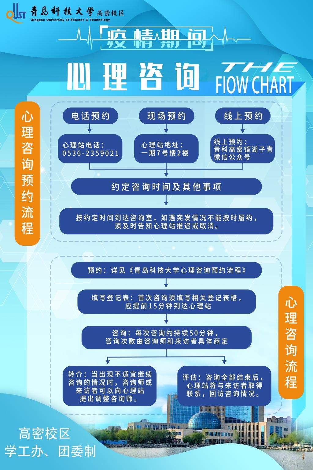 高密校区学生心理工作通过咨询师梧桐学舍“坐诊”、心理测评“切脉”、关心关注“动态化”、咨询预约“多平台”、共建资源“助力”、会诊转介“拓宽”,积极帮助学生消除焦虑、减轻恐慌、调适心理,以平和心态面对疫情。