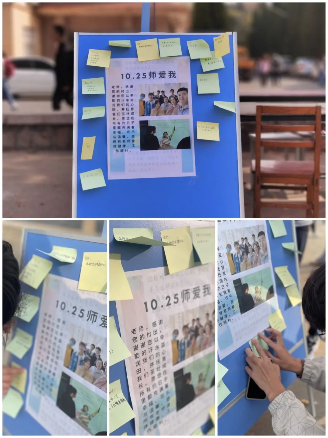 10月25日,学院心理健康协会在小五四广场设置"心语心愿板”,邀请同学们在便利贴上写下对老师的感激与祝福。同学们一字一画地写下了他们对老师的祝愿、对未来的憧憬、对祖国的展望。他们眼里既有坚定不移,也有星辰大海。老师陪他们走过风风雨雨,他们用实际行动回报老师和母校。