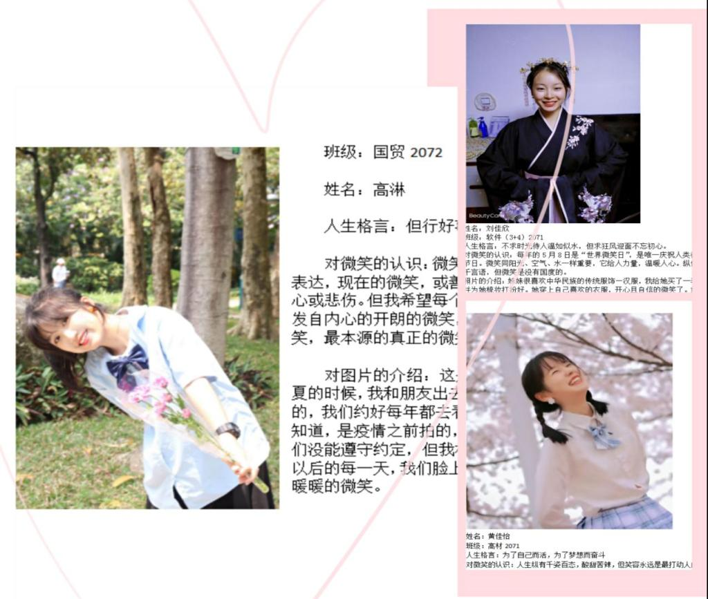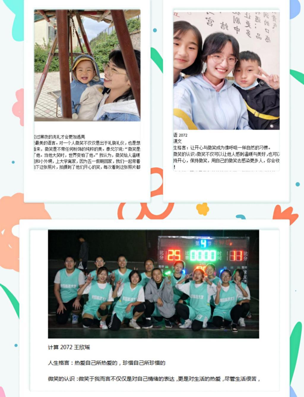 5月6日至12日开展“带着微笑出发”笑脸征集活动,寻找自己或家人、朋友、同学中最灿烂、美丽、温暖人心的照片,展示照片的故事和微笑的含义,在笑脸中温暖、感染人心。活动征集到800余名同学提交的作品。