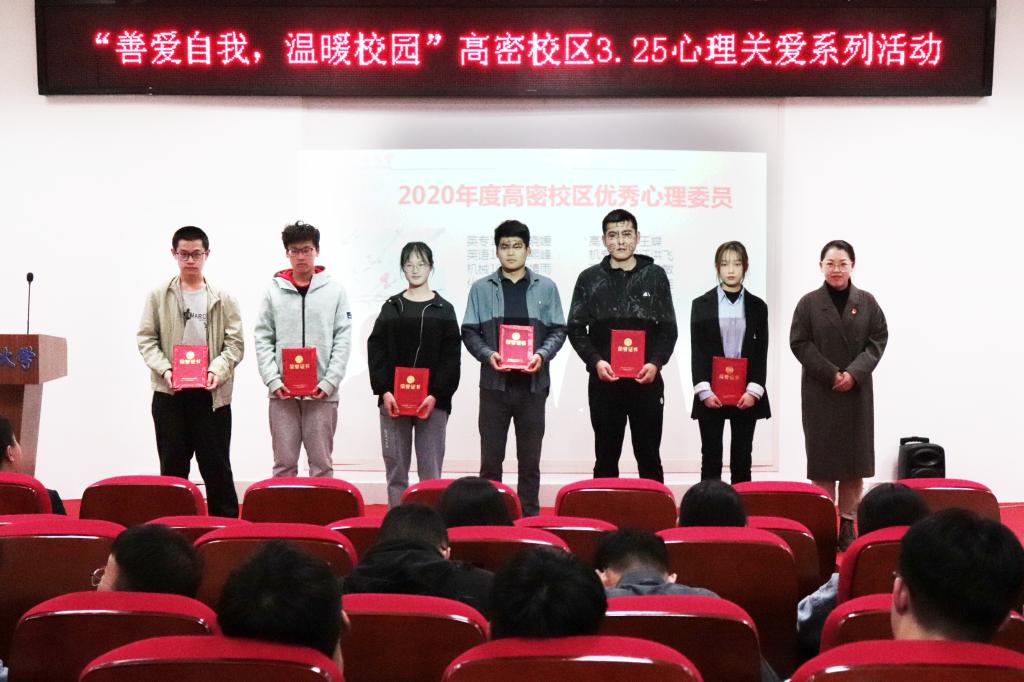 启动仪式上,驻站咨询师李鹏飞(女)为2020年度高密校区优秀心理委员颁奖。